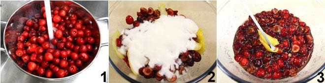 To prepare the cherry jam, start by removing the stems from the cherries. Wash them well 1, then dry them and cut them in half, removing the pit (this will yield about 2.2 lbs of cherries). Place the cherries in a bowl and add the sugar, lemon zest, and 3 tablespoons of lemon juice 2. Cover the bowl with plastic wrap and let it rest for at least 6 hours or overnight in a cool, dry place or in the refrigerator. After this time, remove the lemon zest 3.