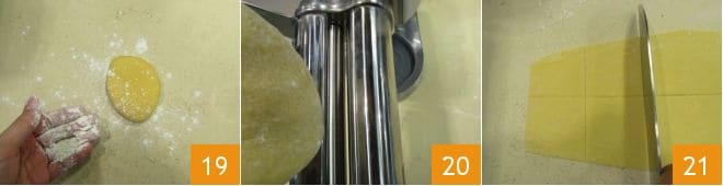 Take the dough, divide it into pieces with a dough cutter, flour each piece 19, pass the first piece (you can keep the others wrapped in plastic wrap until you roll them out) and insert it into the pasta machine 20, you will need to work it from the thickest setting to the second last, passing the pasta through this setting multiple times until you obtain sheets about 1/16 inch thick (2-3 mm). Divide the sheet in half and cut into squares about 2x2 inches 21.