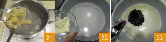 Boil the ravioli for 5 minutes in the pot with water that has reached boiling 31, meanwhile melt the butter in a pan 32 and add the young wine sauce 33, heat over moderate heat.