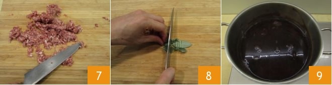 and remove it, chop the sausage 7 and sage leaves 8. Meanwhile, the chestnuts will have cooked 9.