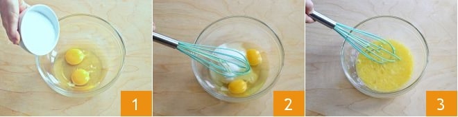 In a bowl, pour the 2 whole eggs together with the sugar 1, then work them with a whisk for 2-3 minutes (2-3).