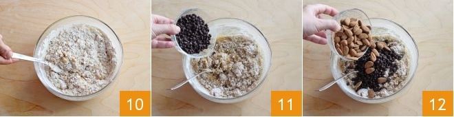 mix with a fork 10 and add both the chocolate chips 11 and the whole unpeeled almonds 12.