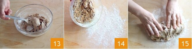 Mix again 13 and if necessary add more all-purpose flour, then transfer the mixture onto a lightly floured surface 14 and compact it with your hands 15.