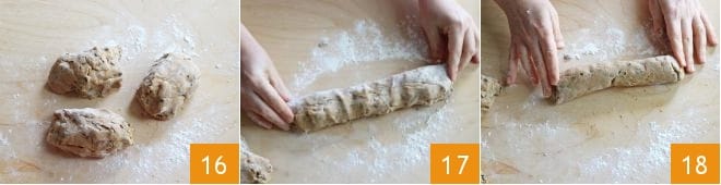 Arrange them on a baking sheet lined with parchment paper, spacing them apart 19. Bake in a static oven at 356°F for 20 minutes on the middle shelf, then take them out 20 and wait a few minutes. When they are not hot, transfer the first log onto a cutting board and cut it into oblique slices about 0.6 inches thick 21.