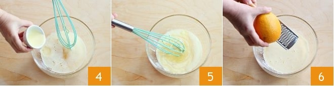 Add the melted butter 4 and beat again until you get a frothy mixture 5. Add the grated orange zest 6,