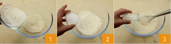 Before starting to prepare the chestnut flour crepes with mascarpone and chocolate ganache, make sure to melt and then cool the butter. Begin with the crepe batter: place the sifted all-purpose flour and chestnut flour in a large, high-rimmed bowl 1, add the sugar 2, and the pinch of salt 3.