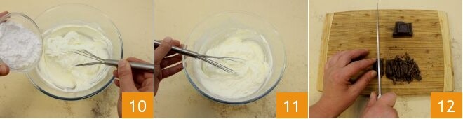Then add the sifted powdered sugar, always stirring 10. Once ready 11, cover the mascarpone cream with plastic wrap in contact and place it in the refrigerator to rest. Meanwhile, prepare the chocolate ganache: heat the fresh cream in a saucepan and, in the meantime, coarsely chop the dark chocolate with a knife 12.