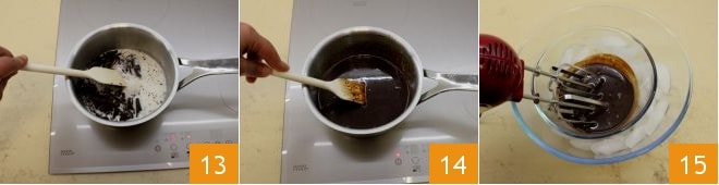 As soon as the cream begins to boil, turn off the heat and add the chopped chocolate. Stir with a wooden spoon to combine the ingredients 13 and, when the chocolate is completely melted 14, cool the ganache by placing it in a bain-marie in a bowl full of ice; using an electric mixer, work the ganache for about 10 minutes to make it creamy, dense, and glossy 15, then set aside.
