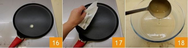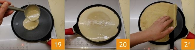 And pour a ladle of batter in the center of the pan 19, rotating it so that it spreads evenly over the entire surface 20. Cook the crepe on one side for a few minutes, then gently flip it with a spatula 21, cooking it for another minute on the other side.