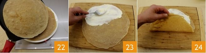 Transfer the ready crepes to a plate and stack them one on top of the other 22, repeating the operation until the batter is finished: with these quantities, you will obtain 8 crepes. At this point, take a crepe and use a spoon to fill it halfway with the mascarpone cream 23; fold it into a half-moon 24