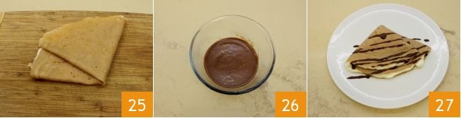 And then fold it again in half 25; plate on a serving dish and decorate as desired with the ganache 26. Serve the chestnut flour crepes with mascarpone and chocolate ganache hot 27.