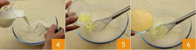 Pour the milk in a thin stream, stirring well with a whisk to avoid lumps 4, then add the melted and cooled butter 5. In a separate small bowl, beat the eggs and then add them to the mixture 6.