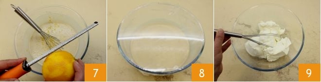 Add the grated orange zest 7 and mix to combine the ingredients until you obtain a smooth and homogeneous batter; place the batter in the refrigerator to rest for at least 30 minutes, covered with plastic wrap 8. Meanwhile, prepare the mascarpone cream: in a bowl, mix the mascarpone with a whisk to soften it 9,