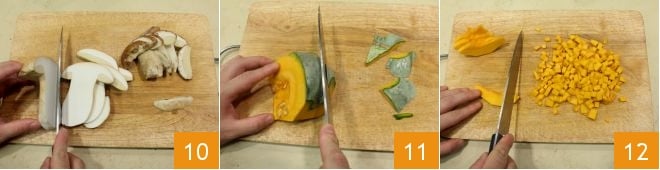 Once cleaned, cut the whole mushrooms lengthwise 10. Cut the pumpkin in half and then into slices, remove the seeds and internal filaments; peel it 11, and cut it into cubes of about 0.79 inches (2 cm) 12, setting aside the vegetables you have cut.