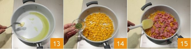 Sauté the garlic clove in a large non-stick pot with the oil; when the garlic is golden brown, remove it 13 and then add the cubed pumpkin. Finely chop some of the rosemary leaves (keep the remaining needles whole) and add them to the pumpkin 14 along with the crumbled sausage, cooking for 6 minutes over high heat 15.