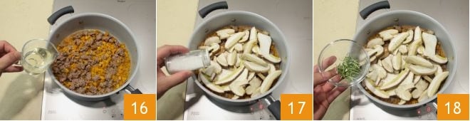 Deglaze with white wine 16 and finally add the mushrooms to the pot; season with salt 17 and pepper to taste, and flavor with the whole rosemary needles you kept 18.
