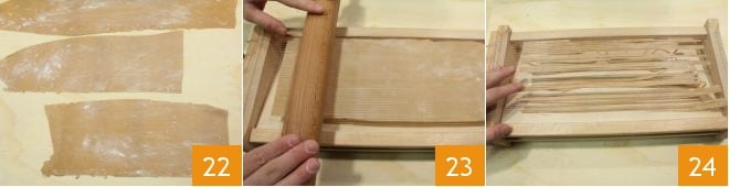 Once the sheets are formed 22, flour them well and then place them one at a time on the chitarra, rolling over with the rolling pin 23 to cut the pasta 24.