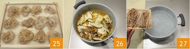 At this point, flour the spaghetti you have obtained and form nests, placing them next to each other on a pasta drying rack to dry for at least 30 minutes (alternatively, you can also place them on a wooden pasta rack). Meanwhile, check that the sauce you prepared is ready 26. After the necessary resting time, bring a pot of salted water to a boil, then add the spaghetti 27, cooking them for about 5 minutes.