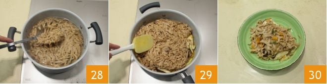 Drain the pasta 28 and mix it with the sauce, stirring well with a spatula and sautéing everything for 1-2 minutes maximum 29. Finally, plate and serve your chestnut flour spaghetti alla chitarra with pumpkin, mushrooms, and sausage 30.