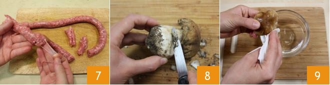 In the meantime, focus on preparing the sauce: cut the sausage and remove the casing, gently pulling it away with your hands 7; crumble the sausage into a large bowl and set aside. Then proceed with How to Clean Porcini Mushrooms: with a sharp smooth-bladed knife, remove the earthy part on the stem, gently scraping until all traces of soil are eliminated 8. If the mushrooms are clean enough, remove any remaining soil with a brush or a cotton cloth 9, otherwise, if they are still very dirty, quickly pass them under a stream of cold running water.