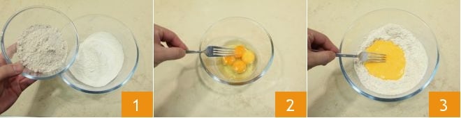 To prepare the chestnut flour spaghetti alla chitarra with mushrooms, pumpkin, and sausage, start with making the pasta. Place the sifted all-purpose flour along with the chestnut flour in a large bowl 1, then make a well in the center. In a separate container, beat the whole eggs and yolks 2 at room temperature and pour them into the flours 3.