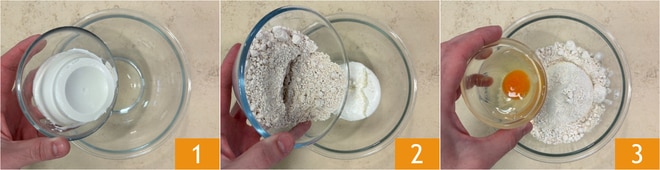 To prepare the chestnut gnocchi with pumpkin and speck, start with the gnocchi dough: in a bowl, combine the ricotta 1, the chestnut flour 2, and the egg 3.