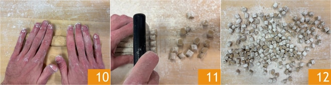 Form rolls 10, then cut them into pieces about 3/4 inch 11. Set the gnocchi aside 12 and prepare the sauce.