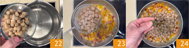 Heat the oil in a pan, add the speck 16, and sauté over low heat for a couple of minutes 17, then add the pumpkin 18.