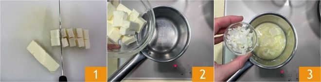 To make the chestnut risotto with castelmagno fondue, start by preparing the acidic butter: cut the butter into cubes 1, place it in a small saucepan, melt it over very low heat 2, and then add the chopped onion 3. Let it cook for about 5 minutes.