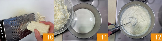 Grate the cheese with a coarse-grated grater 10. Heat the cream in a small saucepan over very low heat, then add the castelmagno 11. Slowly melt the cheese, stirring occasionally with a spoon or whisk 12.