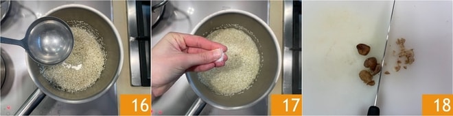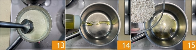 Once completely melted, blend with an immersion blender 13, then pour it into a squeeze bottle, keeping 2 tablespoons aside to mix into the risotto. Leave it at room temperature. Begin cooking the risotto: pour a drizzle of oil into a pan 14 and add the rice 15, then toast until the grains are transparent.