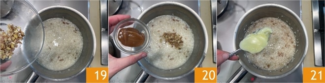 At the end of cooking, add the chopped pre-cooked chestnuts 19, then mix in the chestnut cream 20, the reserved castelmagno fondue, and the chilled and set acidic butter 21.