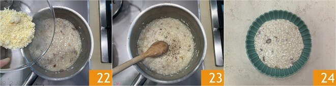 Finish with grated Parmigiano Reggiano 22, then adjust the salt and pepper. Combine everything 23 and plate 24.