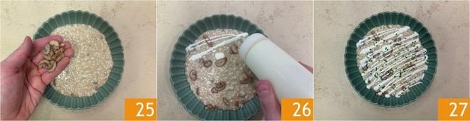 Garnish the plates with the reserved whole chestnuts 25, then create strips with the castelmagno fondue squeeze bottle 26 and garnish with chopped chives. Your chestnut risotto with castelmagno fondue is ready to be served 27!