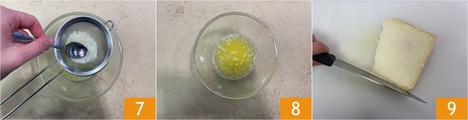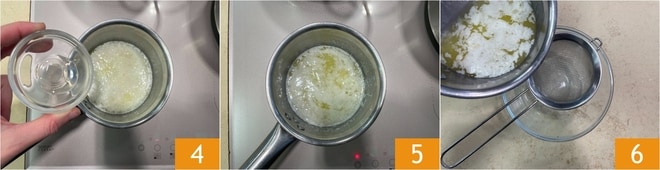 Turn off the heat and add the vinegar 4, then stir 5 and strain with a small sieve into a bowl 6.