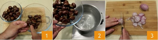 To prepare the chestnut velouté with porcini mushrooms and crispy guanciale, start by placing a pot of water on the stove to prepare the Vegetable broth. Then proceed to clean the chestnuts: score the chestnuts with a small knife 1 and then boil them in a pressure cooker with plenty of water for 12 minutes 2 (alternatively, you can use a regular pot and cook for about 30 minutes). Take the shallot, remove the skin, and cut it into rings 3.