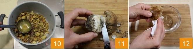 Brown for 2 minutes and then pour the vegetable broth you prepared, covering the chestnuts well 10: keep some aside and add it if the broth dries out. Cook over high heat for 15-20 minutes and, in the meantime, take care of cleaning the How to Clean Porcini Mushrooms: with a sharp, smooth-bladed knife, remove the earthy part on the stem, scraping it gently until all traces of soil are removed 11. If the mushrooms are fairly clean, remove the few soil residues with a brush or a cotton cloth 12, if still very dirty, quickly run them under a stream of cold running water.