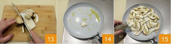 After cleaning, cut the whole mushrooms lengthwise 13. Sauté a clove of garlic in its skin in a non-stick pan with the oil 14, then brown the mushrooms for 10 minutes, seasoning with salt and pepper 15.