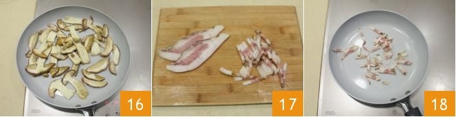 When the mushrooms are ready, turn off the heat and set aside 16. Cut the guanciale into slices and then into strips 17, then cook it for a few minutes over the heat to remove the fat and make it crispy 18.