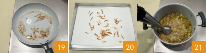Once the guanciale is well browned 19, place it on a baking sheet lined with parchment paper so that it releases the fat created during cooking 20. After the necessary time has passed, the chestnuts will have softened well: turn off the heat and blend them with an immersion blender 21