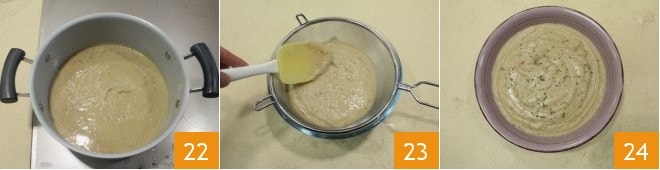 until you get a thick cream 22. At this point, pass the velouté through a fine-mesh sieve until you get a smooth and homogeneous cream 23; transfer it to a serving dish, garnishing it with the mushrooms and crispy guanciale you prepared. Your tasty chestnut velouté with porcini mushrooms and crispy guanciale is ready: enjoy it right away 24!