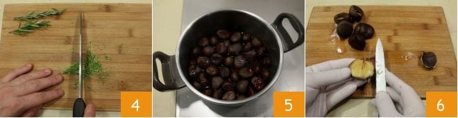 Finely chop the rosemary 4 and set aside. When the chestnuts are ready 5, put on latex gloves and peel them still warm with a small knife, removing them one at a time from their cooking liquid as you clean them 6.