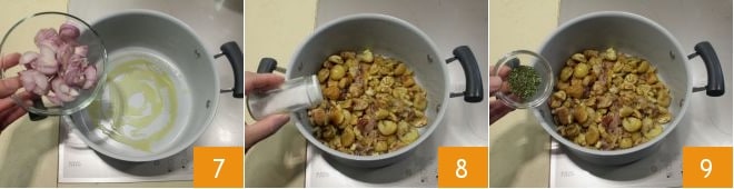 After this process, sauté the shallot over medium heat in a non-stick pan with the oil, stirring well with a spatula 7. Place the previously cleaned chestnuts over the heat, adding salt and pepper to your liking 8 along with the chopped rosemary 9.