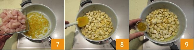 Let it wilt over low heat, then add the chicken breast 7, brown it, stirring often 8, and add the curry 9.