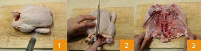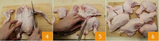 Cut off the wings 4 and divide the chicken into pieces, being careful not to shatter the bones (5-6).
