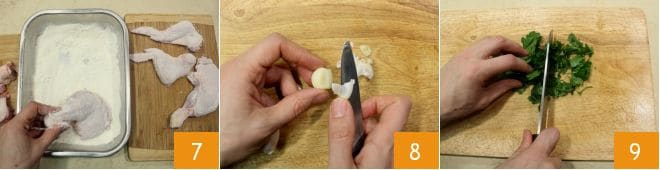 Coat the chicken pieces in flour 7; then peel the garlic clove 8 and finely chop the parsley bunch 9.