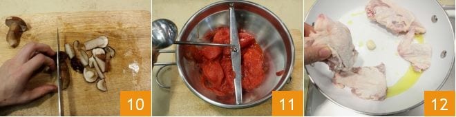 Clean the mushrooms (you can consult the Cooking School: How to Clean Porcini Mushrooms) and slice them thinly 10. Then pass the peeled tomatoes 11 and collect the pulp in a small bowl. Heat a drizzle of oil with the peeled garlic clove in a pan; then add the chicken pieces 12 and brown them.