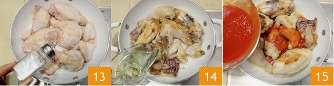 Salt 13 and pepper to taste, and when the chicken is well browned, pour in 100 ml of white wine 14. Let it evaporate before adding the peeled tomato puree 15. Cook for about 20 minutes with the lid on.
