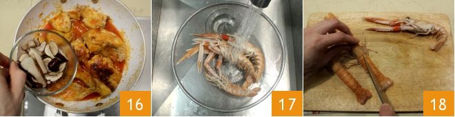 Then add the mushrooms to the chicken and let it cook for another 20 minutes. Meanwhile, clean the prawns under running water 17 and cut the shell 18.