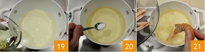 In a saucepan, pour the remaining white wine 19, salt it 20, and as soon as it begins to simmer, add the prawns 21, cooking them for at least 5 minutes.